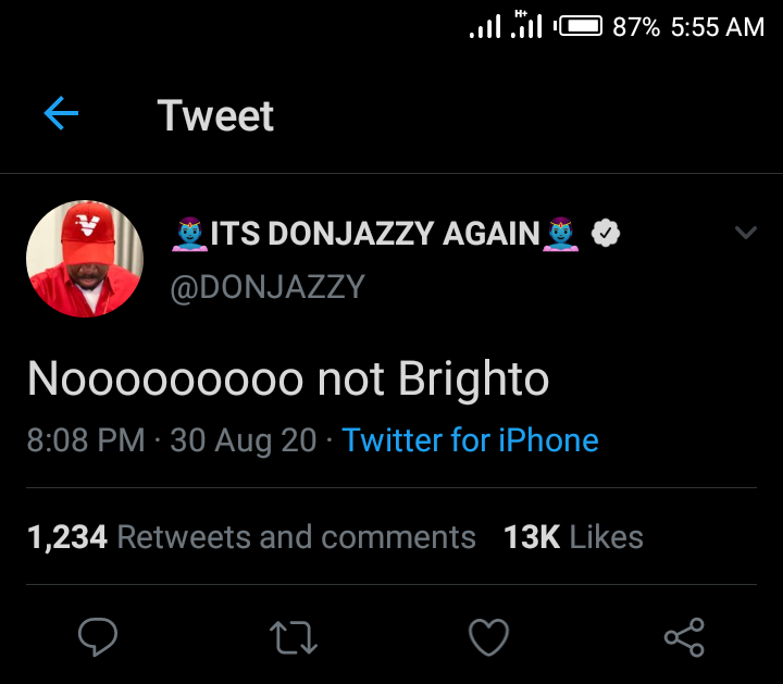 He argued that it was not fair to Brighto for him to be evicted at this time of the show. Several fan of his joined the bandwagon as they were in support of Don Jazzy’s views.